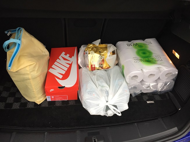車のトランクに、水、トイレットペーパー、食料、煮炊きできるもの、燃料、フライパン、NIKE。