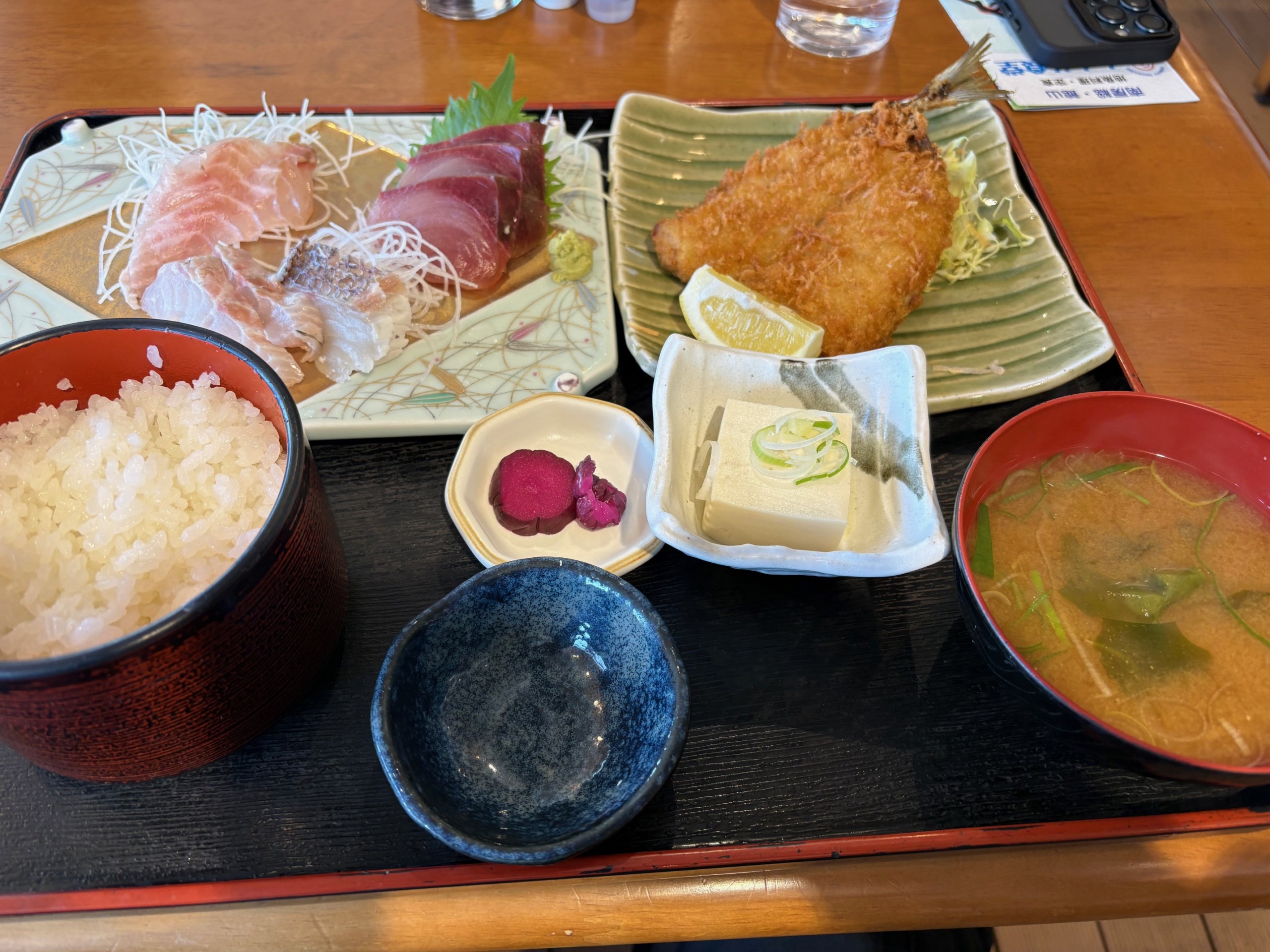 いや~~おいしい!!炊き立ての「米」に刺身!!さらに、アジフライがふわふわでほんとにうまい!!